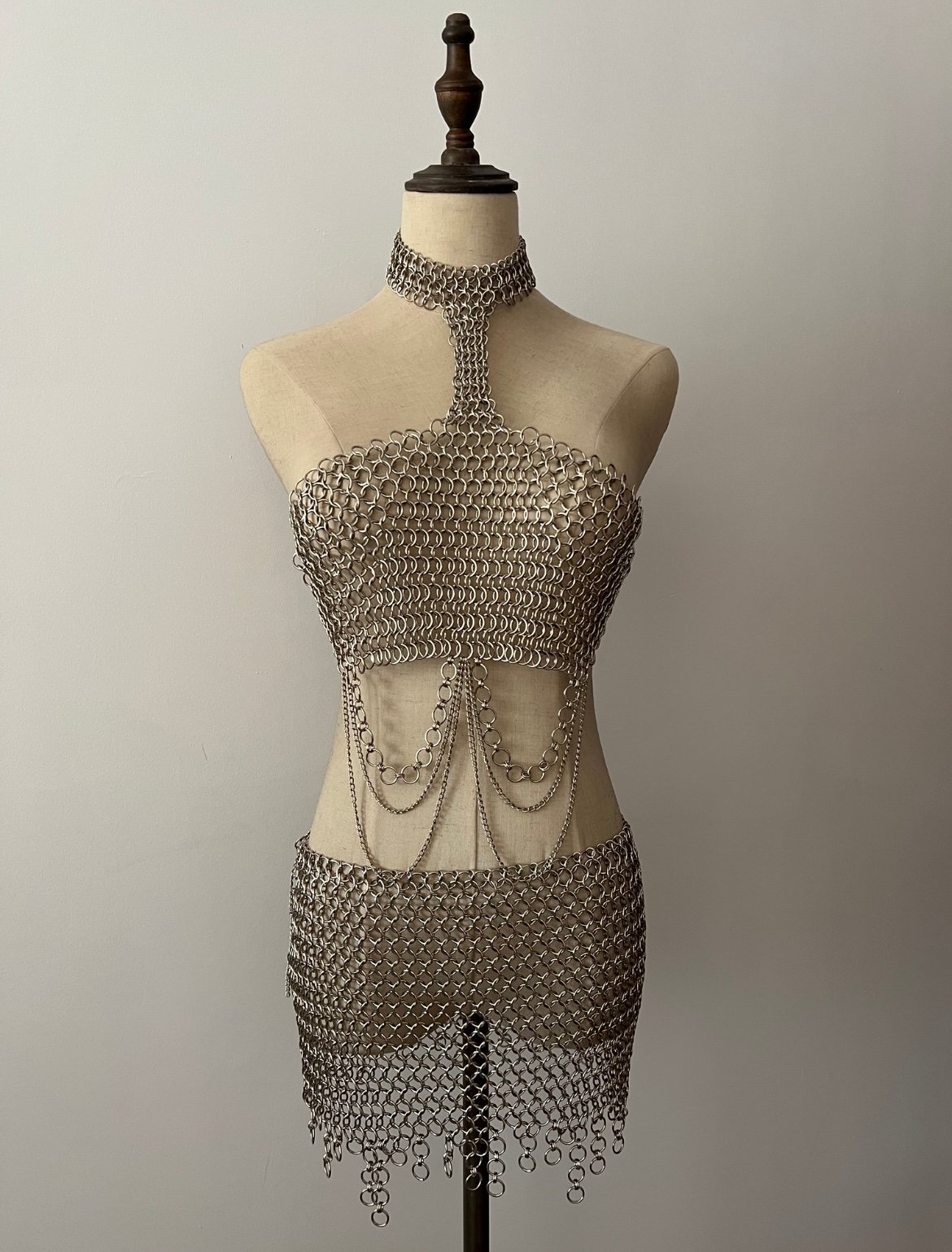 Handmade chainmail top made of nickel plated silver steel - the nickel plating method prevents steel from corrosion and provides a silver shine