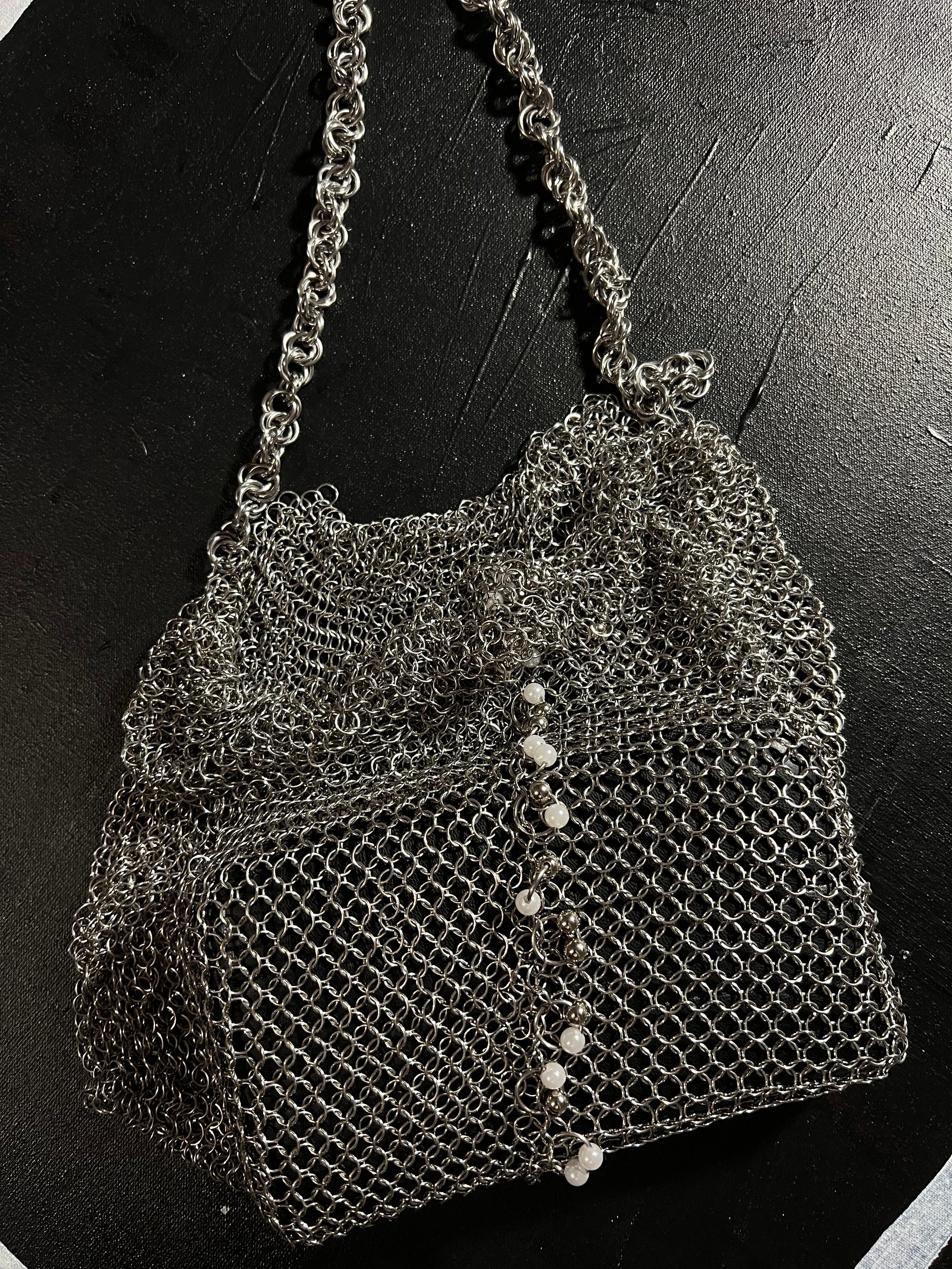 Irregular stainless steel wires chain bag - made from stainless steel / acrylic beads.
