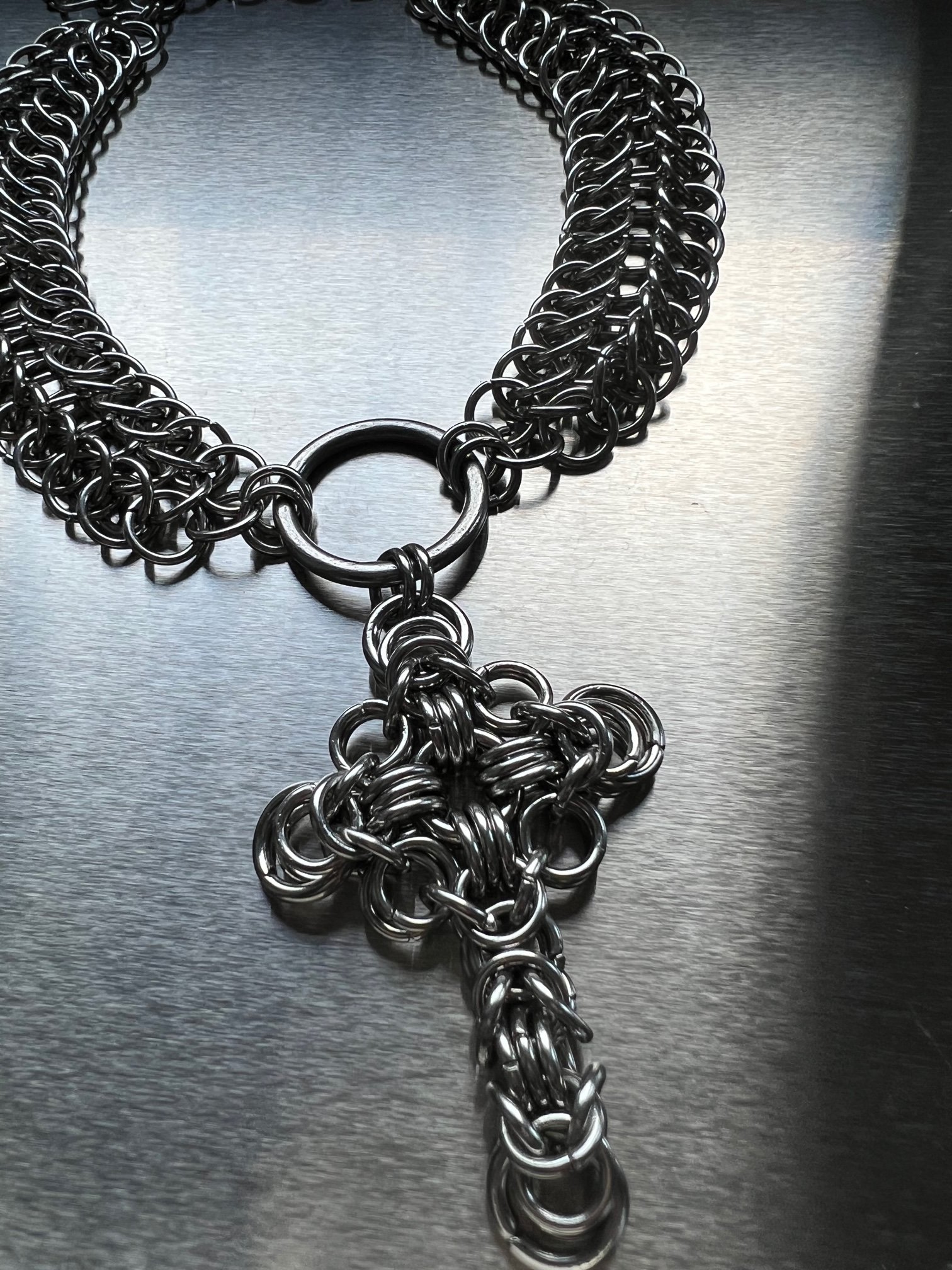 Thick chainmail choker or necklace made of hypoallergenic stainless steel jump rings with the cross