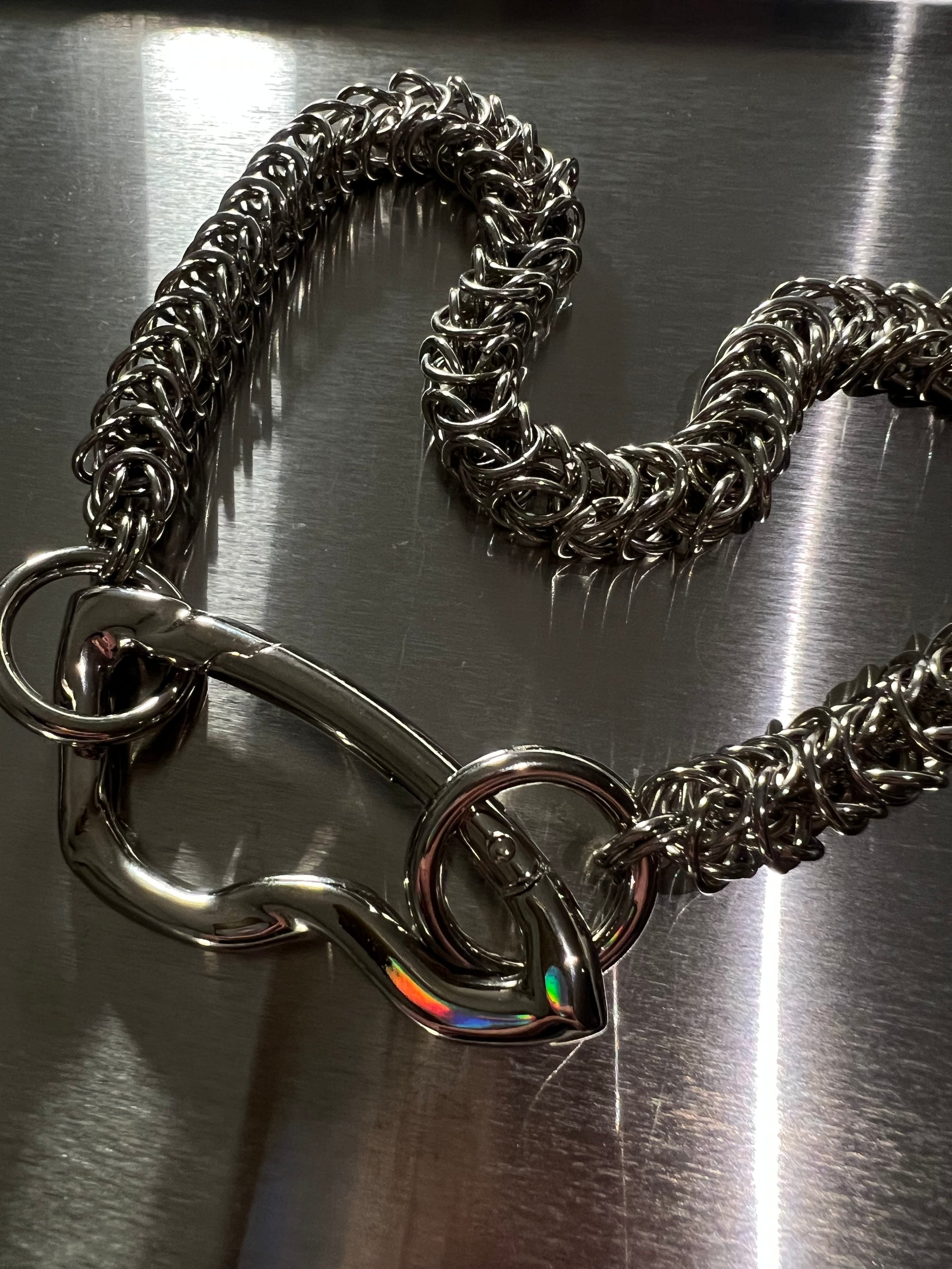 Thick chainmail cnecklace made of hypoallergenic stainless steel jump rings with metal hook.