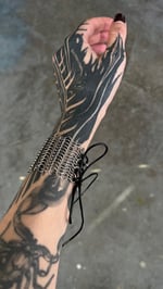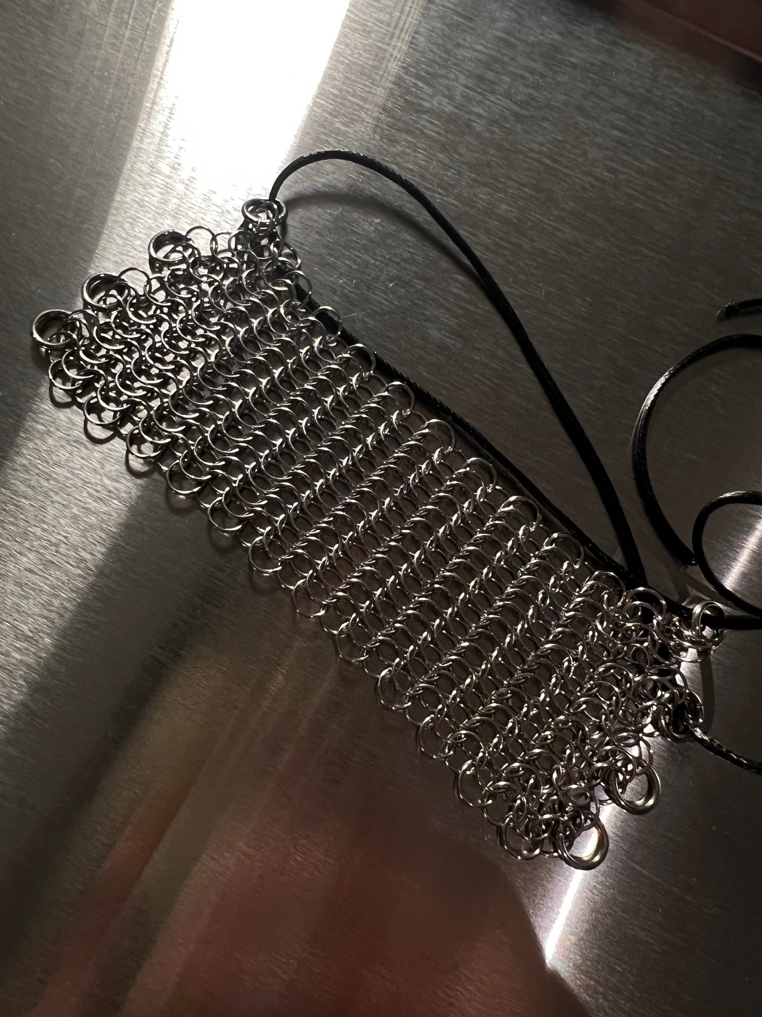Delicate chainmail bracelet made of stainless steel, adjustable with a leather strap.